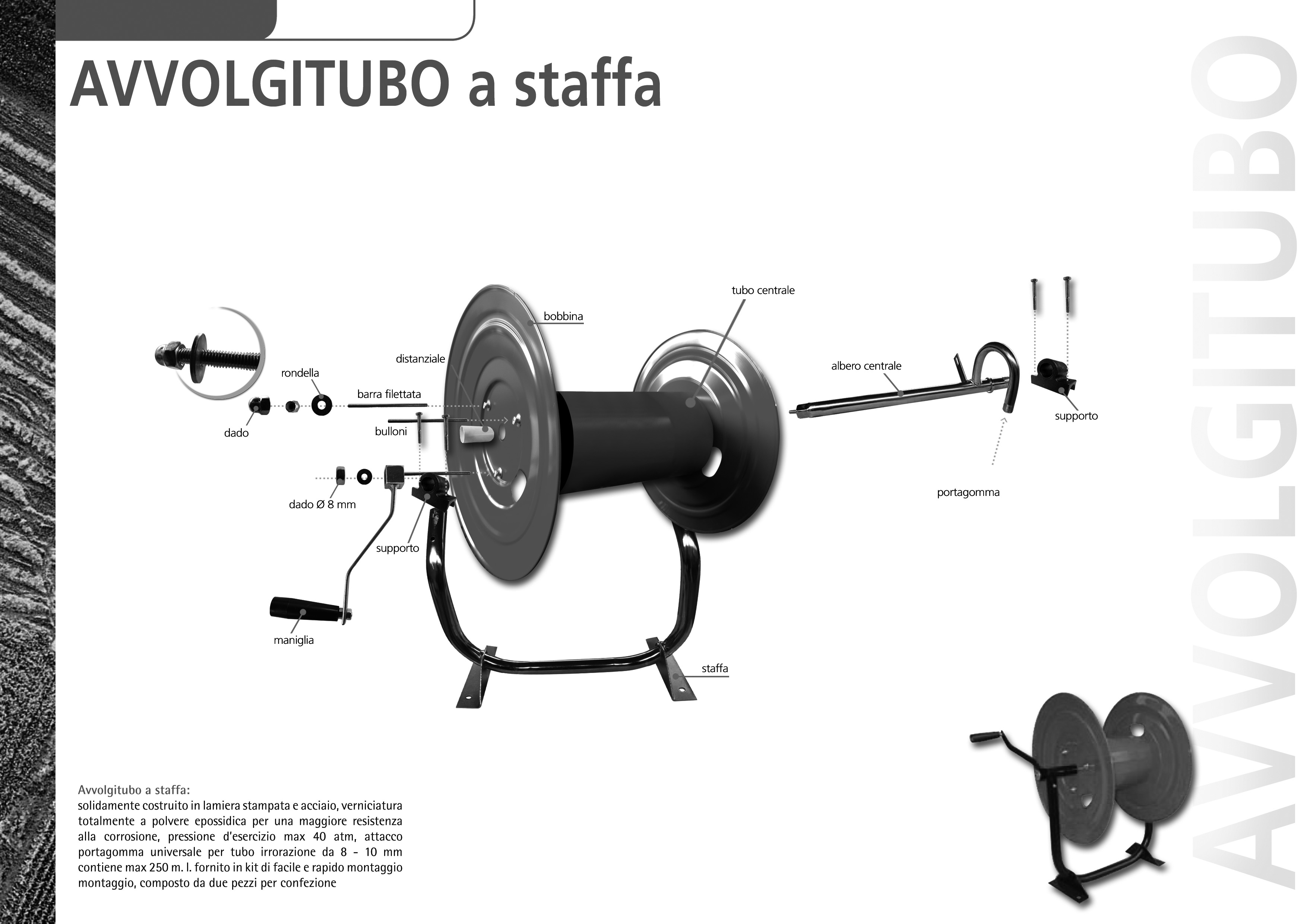 Avvolgitubo con base a staffa, struttura in acciaio, asse centrale in fibra di vetro con fusione degli inserti in acciaio zincato, maniglia in fibra di vetro con impugnatura girevole in gomma.