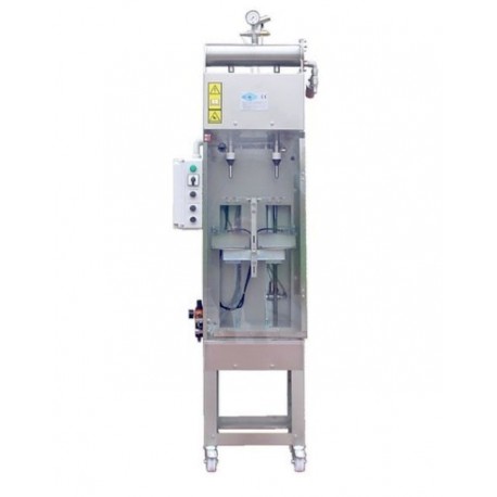 Sollevamento bottiglia, immissione di gas in pressione e riempimento prodotto in automatico
